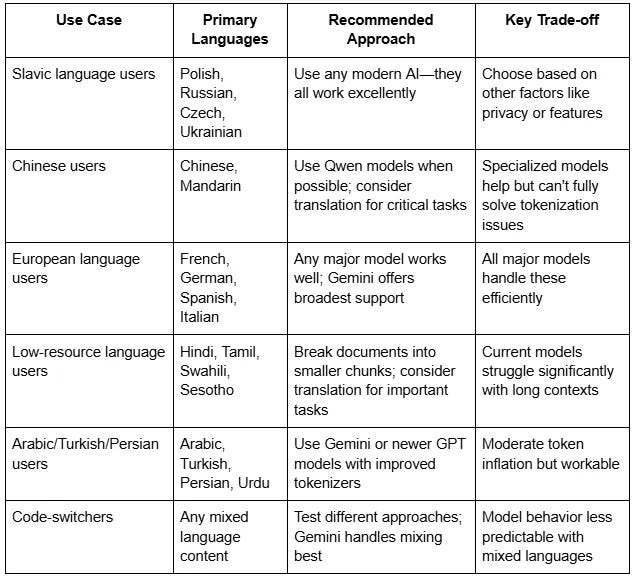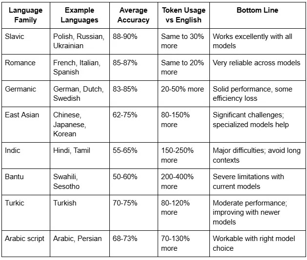 Script compatibility: Polish uses the Latin alphabet, just like English. This means it tokenizes efficiently — words don’t fragment into tiny pieces like they do in some other languages.