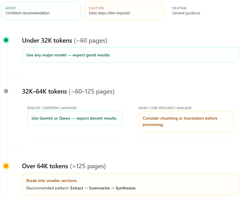 Furthermore, as documents got longer, the gap between best worsst performing languages grew wider. At shorter lengths, all languages performed similarly. But when researchers pushed to 100+ page documents, the difference between the best and worst languages jumped from 11% to 34%.